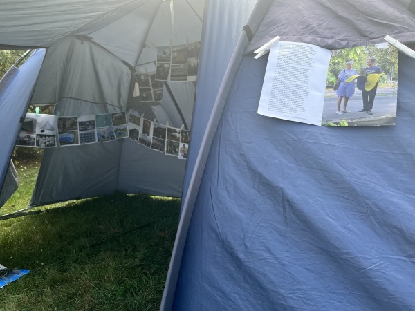 Jako extenze k výstavě Dát se do pohybu v rámci cyklu Rodičovská spolu s Janem Fabiánem v prostoru Olga vznikla týdenní intervence v parku Františka Suchého. Sestávala se ze stanu druhotného využití a z fotografií nalezených na internetu týkajících se motivu stanu v co nejpestřejší šíři souvislostí – od komerčních snímků propagujících výrobek stanu, přes stan jako motiv volnočasových aktivit, dále stan jako umělecký objekt, stan ve využití armády a zejména stan jako motiv provizoria pro život lidí prchajících před válkou, klimatickou nouzí až po stany, jež využívají lidé bez domova.